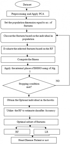 In this work, the data is first preprocessed, and missing values are filled with mean values. Then, data is scaled using standard scaler, and the proposed hybrid PCA and BHHO are applied to select the best features. RF and logistic regression are employed to classify the patients as heart disease patients or not.