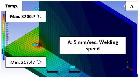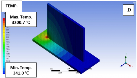 Many assumptions were made while developing the coupled thermo-mechanical model. The minor effect of stress deformation heat on the temperature field is ignored since it is so tiny compared to the transient thermal field's dominating impact on mechanical properties. Nothing in the temperature or stress field pertains to the latent heat of phase shift or the weak phase transition resulting from stress. Additionally, the effect of the body's gravitational pull on the fluid's flow inside the melt pool must be addressed. The two-stage solution approach used in numerical simulations is known as indirect coupling. The first step is performing a moving heat source thermal analysis on the fusion zone and the surrounding area to determine the dynamic thermal distribution and evolution. Afterward, a linear static stress analysis is carried out. Mechanical elastic-plastic calculations rely on the node temperature distribution derived from a thermal load used in stress analysis. Mechanical computing makes use of boundary restrictions to prevent inflexible body movement. The finite element (FE) model is fixed at the T-joint base of the weldment. The total simulation time was 30 sec., and the simulation was done by using (a moving heat source) ANSYS ACT.