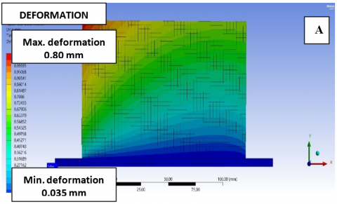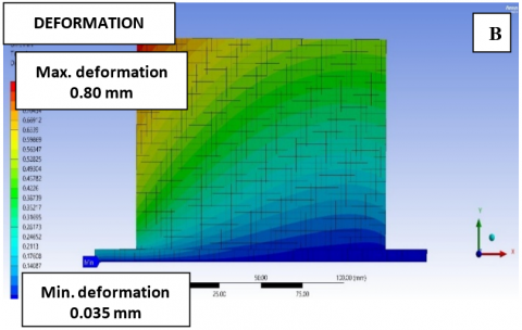 Figure 7 offers the deformation outcomes for the welding simulations carried out at three welding speeds of 5, 6, and 7.5 mm/s. These results replicate the thermal and mechanical interactions that occur at some point in the welding manner, highlighting the effect of welding speed on deformation in the weld joint 5 mm/s, shown in Figure 7(A) reveals the largest deformation of 1.08 mm, mostly due to the longer exposure time of the material to the heat source. Lower welding speeds bring about extra heat input in step with unit length, main to better thermal gradients and elevated thermal enlargement. This, in turn, reasons large plastic deformations upon cooling. Deformation is reduced to 0.80 mm because the welding velocity increases to 6 mm/s, Figure 7(B). The shorter publicity time decreases the overall heat input, decreasing thermal gradients and the significance of residual stresses. The stability between thermal entry and cooling charge starts to decrease distortion. 7.5 mm/s, in Figure 7(C), welding speed produces the least deformation of 0.57 mm, way to the minimum heat entry and speedy cooling associated with the faster velocity. The reduced thermal gradients restrict base metal grain enlargement and contraction, resulting in lower residual stresses and distortion. The effects display an inverse relationship between welding speed and deformation. Faster welding speeds reduce the heat input in line with unit length, leading to decreased thermal gradients and smaller deformations. Also, the results tested that deformation is localized near the weld pool and reduces progressively with distance from the welding line. This pattern is regular across all speeds; however, it is most suggested at 5 mm/sec due to the better heat entering. Faster welding speeds lessen the volume of deformation, with smaller affected areas around the weld pool.