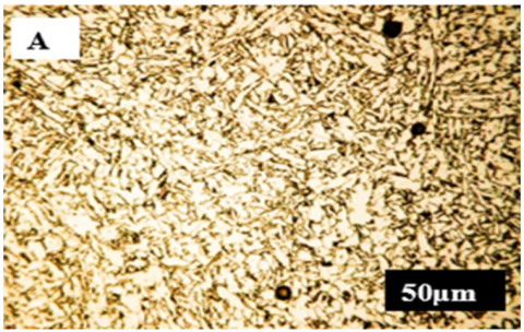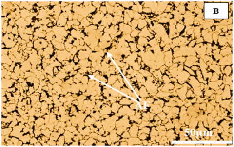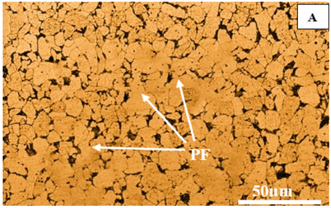 The sample is a conventional alloy steel with a reduced carbon percentage. As the FZ slowly cooled from the γ-austenite phase with a face-centered cubic microstructure to a temperature below 1173 K, the development of α-ferrite with a body-centered cubic crystal structure begins and increases with time. As the carbon concentration increases, the amount of remaining austenite decreases progressively. At the equilibrium temperature of around 1000 K, the remaining austenite reaches a composition referred to as the eutectoid composition, which contains 0.76% carbon. As the temperature drops, austenite fully transforms into pearlite. The microstructure comprises Widmannstetter ferrite (WF), polygonal ferrite (PF), bainite (B), martensite, and acicular ferrite (AF), as shown in Figure 9(A) with a hardness value of 269 HV.