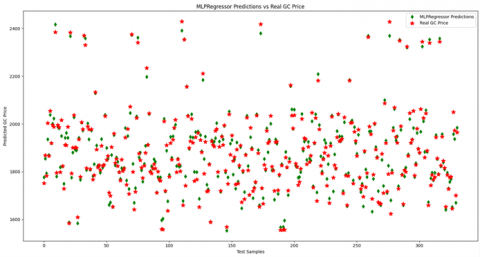 The Genetic Algorithm-optimized Multi-Layer Perceptron (MLP) regression model demonstrated excellent predictive accuracy, explaining approximately 98% of the variance in gold prices with an R² score of 0.98. Key performance metrics, including a low RMSE (23.48 USD) and MAE (17.38 USD), highlight the model’s ability to generalize well and make accurate predictions even in a volatile market. Furthermore, the principal components PC1 and PC2 emerged as the most influential features, collectively capturing 96.37% of the variance in the dataset.