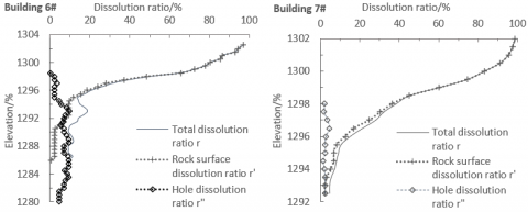 (2) With the growing depth, the rock surface dissolution ratio and total dissolution ratio both decrease exponentially. If the site has highly developed holes, the rock surface dissolution ratio will decrease faster than the total dissolution ratio, as the depth gradually increases.