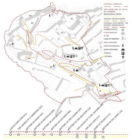 The degree of conciliation varies regarding the similarities and differences between traditional cultural heritage (REALITY) and the set of the cinema productions (FICTION). Referring to our study case, we have concluded that the degree of conciliation between its built/ landscape heritage and the four film sceneries is high, given the fact that both cinema productions are historical and that their film sceneries are located alongside the western Renaissance walls, which are highly protected according to the Special Protection Plan for Heritage of the city and in the northern beach from which we can admire the whole complex, declared a Historic-Artistic Site in 1972. Furthermore, the union of the four film sceneries through the built heritage results in a structure of cultural interest that entirely matches a stage of one of the cultural routes offered by the host community, the Historic Centre Route and has points in common with the rest, as we can observe in the following location plan (Figure 10). In short, the location of the film sceneries inside and in the surroundings of the Historic Centre of Peñíscola highlights the local built heritage of the site and, consequently, it is a good way to present it to the public.