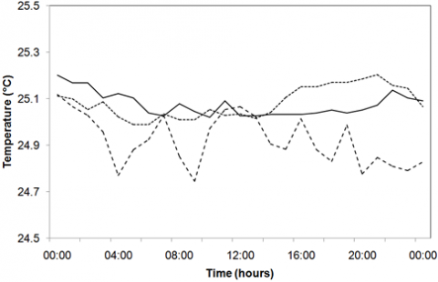 The main parameter used in this study is the temperature measured of inside the greenhouse for several constraints. Initially, it is a question of determining the temperatures of the inside environment, and in order to have a representative state, the probe PT100 was placed on the same vertical axis and at to the heights of 2.5 m, 1.5 m and 0.5 m. In this perspective, it has proposed to plot the temperature profiles corresponding to the period from 13th to 20th February 2017 (Figure 9). The results show that whatever the height the curves follow the same pattern with a small error, and the phenomenon of the air temperature stratification is not significant. For this reason, we assume that the temperature distribution in the greenhouse is almost uniform.