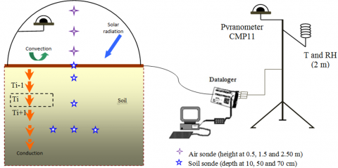 Numerous climate parameters have been systematically measured including the air temperature inside the greenhouse at three heights (50, 150 and 250 cm), on the soil surface, at various depths (10, 50 and 70 cm) and at the same depth 70 cm over similar spaced distances. At the external solicitations: solar irradiance, ambient temperature, etc (Figure 5).