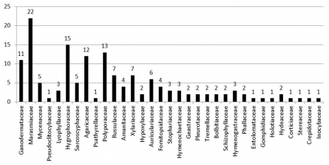 The results showed that there were 148 species of macro mushrooms divided into 33 families which were collected from several types of land use around Lore Lindu National Park, Central Sulawesi. The eleven types of macro mushrooms belong to the Ganodermataceae family, twenty-two belong to the Marasmiaceae family, fifteen to the Hygrophoraceae family, the Mycenaceae and Sarcoscyphaceae families each in the lime genus, twelve to the Agaricaceae family, thirteen to the Polyporaceae family, seven to the Russulacea family, seven to the family Xylariaceae, six to the family Auriculariaceae, the family Fomitopsidaceae and Amanitaceae each consisting of four genera, family Stophariaceae, Lyophyllaceae, Hymenochaetaceae and Hymenogastraceae each three genera, family Hypoxylaceae, Geastraceae, Pleurotaceae, Tremellaceae, Bolbitiaceae, Schizophyllaceae, Phallaceae and Hydnaceae each consist of 2 species. And the rest of the families Pseudoclitocybaceae, Psathyrellaceae, Entolomataceae, Gomphidiaceae, Holotiaceae, Corticiaceae, Stereaceae, Crepidotaceae and Inocybaceae, each represented by only one species (Figure 2). All of the macro-fungal families above belong to the phylum Basidiomycetes, while the other three macro-fungal families namely Sarcoscyphaceae, Xylariaceae and Holotiaceae are included in the phyllum Ascomycetes (Table 2 and Figure 2).