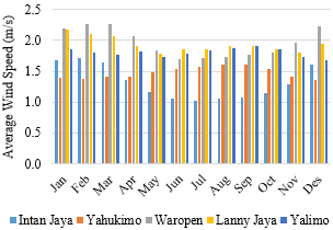 Figure 4 shows the average monthly temperature in several areas that are the subject of research in Papua Province. The figure shows that the highest average temperature is in the city of Waropen in May at 24.63℃. Figure 5 shows the average wind speed in months. The highest average wind speed is in the city of Waropen in February and March at 2.26 m/s. Figure 6 shows the average intensity of solar radiation each month. The highest average intensity of solar radiation is in the city of Waropen, also in February and December, at 5.37 kWh/m2.