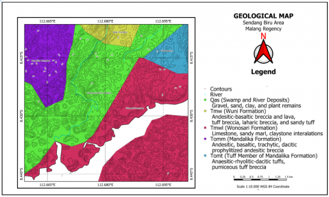 Figure 1 shows a map of the research location. Sendang Biru Beach has a hilly area with moderate to steep slopes with a height of 50-250 meters above sea level, has a flat slope (<3%), slightly sloping (3-8%), rather steep (25-40%) and very steep (40%). Sendang Biru Beach consists of a beach with limestone, coral, and steep walls, and part of it is a sloping beach with a length of 50-100 m on the east and west sides. The rocks of the Sendang Biru region are barren and easily eroded limestone. Based on the geological map, it can be seen that the location is in Wonosari formation (Tmwl), which is dominated by limestone, sandy marl, and claystone inserts. The Wonosari Formation is flanked by the Qas Formation (swamp and river deposits), which is dominated by gravel, sand, clay, and plant debris in the western and northern parts. In the eastern part of Mandalika formation (Tomm) is dominated by andesitic lava, basalt, trachite, dacite, andesitic breccias. The upper north is the Mandalika Formation and the Wuni Formation. Some streams cut along the Qas Formation.