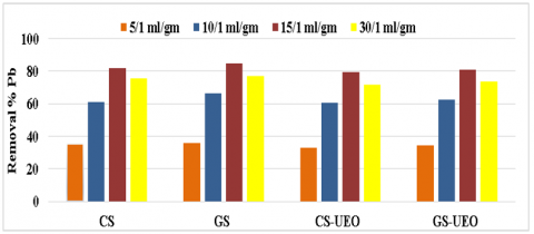 According to the results of Figure 7, the removal of lead increases with an increase of the ratio until it reaches the maximum limit and then begins to decrease. The reason for this may be that an increase where the increase of this ratio indicates an increase in the ability of the removal solution to release Pb ions. The decrease in removal may have occurred due to the solution released most of the lead ions adsorbed to the soil [35]. However, higher this ratio will result in a solution of more residual metals for post-processing [37].