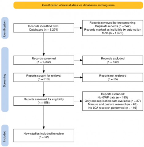 Keywords and search strings were carefully designed to capture studies related to the environmental impact of cattle farming using the LCA method. The keywords used were "Beef Cattle Life Cycle Assessment" which had been accessed from Google Scholar, Scopus, ScienceDirect, and Web of Science from 12 June 2023 to 30 October 2023. The selection process was narrowed down to studies exclusively concerning beef cattle, excluding those related to dairy cattle. LCA methods must be used to conduct the research and contain GWP values. The specified timeframe for study inclusion, from 2015 to 2023, helped to maintain the research currency and considers recent developments. This meta-analysis focused on Beef Cattle LCA exclusively includes papers adopting the cradle-to-gate boundary system. The system boundaries had encompassed post-farm-gate activities, spanning from processing through to consumption. Cradle-to-gate LCA assesses the entire environmental footprint of beef production from the moment raw materials are extracted or sourced (the "cradle") until the product leaves the factory gate. This boundary system accounted for all upstream processes, including feed production, animal husbandry, transportation, and processing, providing a comprehensive view of the environmental effects linked to the entire supply chain. By concentrating on studies employing the cradle-to-gate approach, the meta-analysis ensured a consistent evaluation framework for the environmental impacts of beef cattle production, facilitating meaningful comparisons across the selected papers. The functional unit used in this study was CO2eq/kgLW, with the potential for converting values if discrepancies in functional units were encountered, contingent on data availability in the selected papers. This meticulous selection process ensures that the meta-analysis incorporates studies that align with the research objectives and maintain methodological consistency, thereby enhancing the credibility and reliability of the findings. The total studies included in this meta-analysis were 52 research papers, 89 studies, and 1,258 total sample size. There were several duplicate articles excluded while accessing four different databases and included only one article in this study.