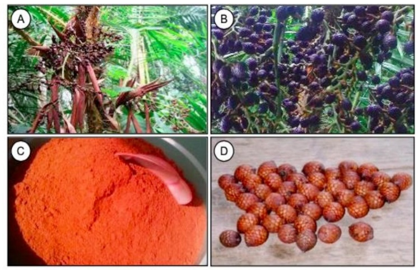 Figure 1. Calamus johndransfieldii (Jernang) plants: (a) Jernang tree grows naturally in the tropical forest, (b) Jernang fruit matured optimally, (c) Jernang resin contains more antioxidant properties especially the dracorhodin, (d) Jernang fruits of Calamus johndransfieldii
