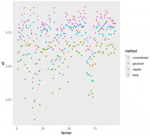 According to Figure 2, most farmers have efficiencies of approximately 80-90% when estimated using the Frank copula SFM (green bar), 70-80% when estimated using the Clayton copula-based SFM (red bar), and 60-70% when estimated using the Gaussian copula-based SFM (blue bar). The efficiencies estimated using the conventional SFM (yellow bar) ranged evenly from 60% to 100%. While a few farmers assessed their efficiencies using the conventional model, which may reach 100%, the conventional model estimation in this study did not overestimate the efficiencies. Therefore, the output of the conventional model is suitable for providing recommendations.