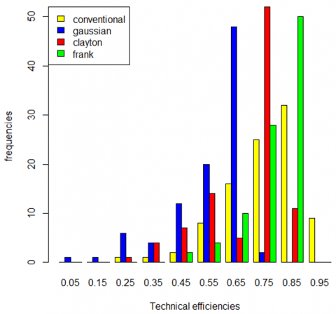 The conventional SFM is still the best appropriate model compared to copula SFM based on AIC and BIC criteria. It delivers more precise estimations of technological efficiency.