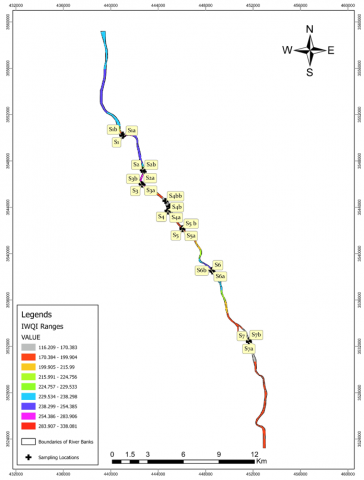 8. This research contributes to pollution control efforts and water resource management in the Kufa River reach. It shows the most affected sites (S3 and S5) and the pollutants posing the extreme risks, particularly cadmium and phosphate. The spatial analysis using IWQI and PCA provides a clear framework for understanding where and why pollution occurs. These results serve as a practical guide for improving wastewater treatment performance, applying real-time water quality monitoring, and focusing regulatory efforts where they are most needed. The study supports proactive, site-specific strategies that can enhance water sustainability and protection public and environmental health.