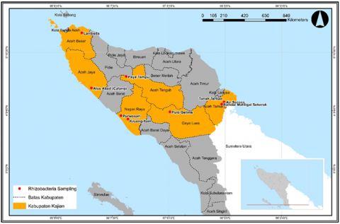 Figure 1. Soil sampling map from the patchouli rhizosphere in several districts of Aceh Province