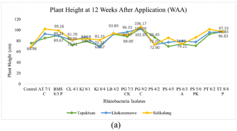 The study's characteristics included the rhizobacterial isolates' capacity to fix nitrogen, solubilize phosphate, generate IAA, and create the enzyme ACC deaminase. At 12 weeks following application (WAA), measurements were also made of the plant's height (cm), number of leaves, number of branches, root volume, wet weight (g), and dry weight (g).