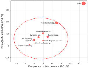 Fish Euphausiacea Detritus Cosmarium sp. Daphnia sp. Synedra sp. Coscinodiscus sp. Skeletonema sp. Frustulia sp. Botryococcus sp. |