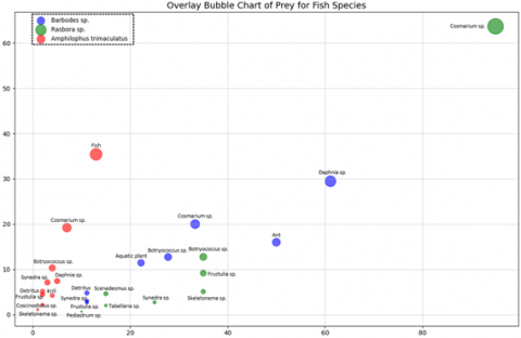 Figure 3. Variations in food types of native and invasive fish in Aneuk Laot Lake, with Barbodes sp. represented by the blue label, Rasbora sp. by the green label, and Amphilophus trimaculatus by the red label