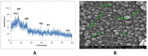 Figure 1. (A) XRD analysis of FeNPs, (B) SEM