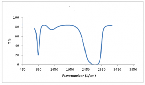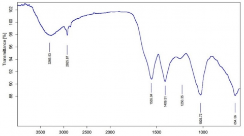 Figure 3 shows the Fourier transform infrared spectra of the reduced iron oxide solution with gum Arabic extract after several weeks to identify the active components that reduced the material and dissolved it into nanoparticles. A broad band was visible around 3265.53 cm-1. This broad, prominent absorption band is characterized by oxygen-hydrogen stretching vibrations. This may arise from the hydroxyl groups of alcohols, phenols, or carboxylic acids present in the gum Arabic extract. It can also be attributed to adsorbed water molecules. The broadening of the peak indicates the presence of hydrogen bonding, which is common for these types of functional groups. This presence indicates the presence of a hydrophilic component within the extract that can interact with the aqueous environment surrounding the nano iron. This could stem from the alcohol, phenolic, or carboxylic hydroxyl moieties within the gum Arabic extract. Moreover, it may come from water molecules bound to the material. The peak broadening reveals the existence of hydrogen bonding, which is typical for such functional groups. This indicates the sap, alongside other components within the extract, contains hydrophilic elements that possess the ability to interact with the surrounding media comprising water in the vicinity of the nano iron. A peak is seen at 2925.87 cm-1. The peak also lies within the region typically associated with the carbon-hydrogen stretching vibrations in aliphatic groups (CH₂, CH₃), demonstrating the presence of hydrocarbon chains in the extract, thus suggesting further the presence of hydrophobic constituents which may contribute to the stabilization or the interaction of iron nanoparticles with nonpolar media.