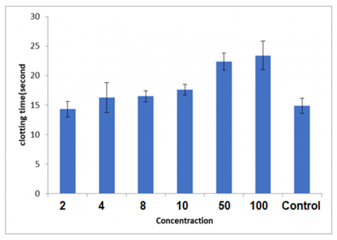 Figure 6 illustrates the in vitro effect of nano-iron synthesized from Arabic gum extract on PTT, which is a crucial indicator of both intrinsic and common coagulation pathways, where prolonged clotting time suggests anticoagulant activity. The results demonstrate a concentration-dependent increase in PTT, indicating that nano-iron influences coagulation kinetics.