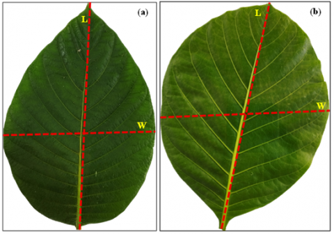 Figure 2. Location of leaf length (L) and width (W) measurements. (a) Cinchona pubescens, (b) Cinchona micrantha