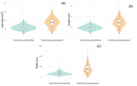 Figure 3. Violin plot illustrating the distribution of three leaf morphometric variables, leaf area (a), length (b), and width (c) for Cinchona micrantha and Cinchona pubescens