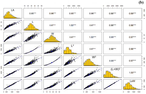 Figure 4 presents scatterplot matrices with Pearson correlation coefficients between leaf area (LA) and six derived morphometric variables: length (L), width (W), the square of length (L²), the square of width (W²), the square of the sum of length and width ((L + W)²), and the product of length and width (L × W), corresponding to leaves of Cinchona micrantha (Figure 4(a)) and Cinchona pubescens (Figure 4(b)). Each cell of the matrix shows the bivariate relationship between a pair of variables, accompanied by the value of Pearson's correlation coefficient and a univariate histogram on the main diagonal representing the distribution of each variable. Statistically significant correlations (p < 0.001) are indicated by three asterisks (***).