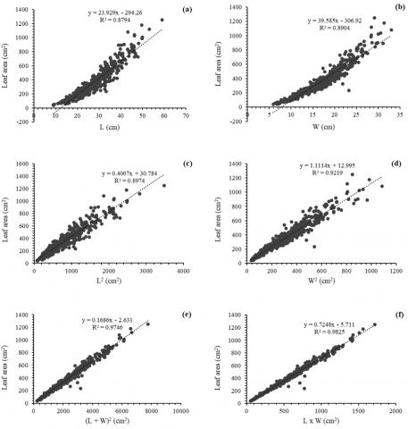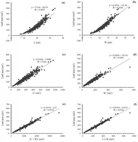 Figure 5 presents the linear regression models fitted to estimate leaf area (cm²) from different leaf morphometric variables. In Figures 5(a) and 5(b), leaf area is related to L and W, respectively, showing significant linear fits with R² values of 0.8953 and 0.9303. Although both models show good predictive capacity, width (W) shows a slightly higher correlation with leaf area.