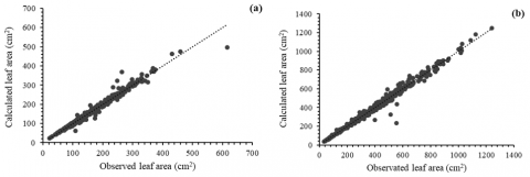 Figures 6(a) and (b) show models using leaf length (L) and width (W) as predictors, respectively. Both models present relatively high coefficients of determination (R² = 0.8794 and R² = 0.8904), indicating a positive and significant association between each dimension and leaf area. However, some scattering of the data is apparent at high values of L and W, suggesting a loss of prediction accuracy when leaf dimensions are extreme.