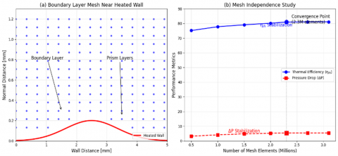According to Table 3, mesh independence was confirmed through systematic refinement (Figure 2), showing less than 0.3% variation in ηth and ΔP between 2.3M and 3.1M element meshes. The O-grid topology provides 15 prism layers with a growth factor of 1.2 to resolve thermal boundary layers. Solver settings used the Phase Coupled SIMPLE algorithm with second-order upwind discretization.