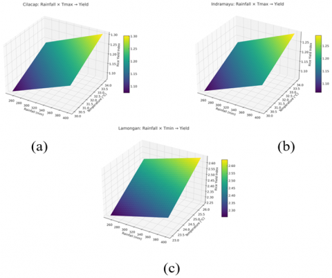In contrast, Figure 4(c) shows the response surface for Lamongan, where rainfall and minimum temperature (Tmin) jointly influence yield. Here, the yield index increases sharply as Tmin rises from 23.0℃ to 26.0℃, especially when rainfall exceeds 300 mm. This steep incline suggests a strong dependency on nighttime temperature, likely due to its role in preventing cold-induced sterility during flowering. The interaction appears more convex, implying a non-linear boost in yield under warm, humid conditions. Overall, these visualizations confirm that climate-yield relationships are both spatially and interactively complex. While higher Tmax benefits rice production in some regions, Tmin plays a more dominant role in others. Rainfall remains a key amplifier of temperature effects across all districts.