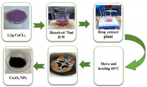 First, nano cobalt oxide was prepared by taking 25 ml of the previously prepared plant extract and distilling it in 0.1 M of 75 ml cobalt chloride and stirring it with a magnetic stirrer at a speed of 400 and a temperature of 60℃ for 3 hours until a color change was observed. After that, it was centrifuged for 20 minutes and washed twice with deionized water and once with alcohol. Figure 2 illustrates preparing pure Co3O4 NPs using Capparis spinosa fruits by the green method.