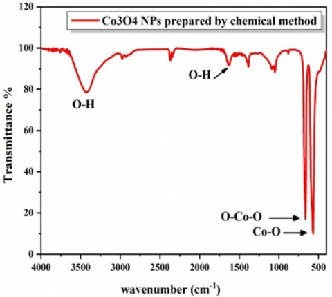 Figure 7. FTIR spectrum for Co3O4 nanoparticle prepared by the green and chemical methods