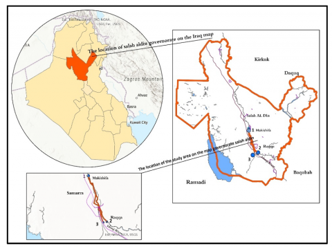 Samarra city is one of the main districts of the Salah al-Din Governorate, Iraq. It is situated on the main road that connects Baghdad and Mosul cities, 120 kilometers north of the capital Baghdad city, and 270 kilometers away from Mosul Governorate. Samarra city is situated between latitudes 34°11'52.00"N and longitudes 43°53'30.84"E, as calculated by latitude and longitude [27]. The study area extends on the Tigris River from the Makishifa city, north of Samarra, to the Samarra barrage lake, reaching the Raqqa area, south of Samarra, as shown in Figure 1. For testing, four stations were selected in the study area along the Tigris River, and samples were taken for three seasons (autumn, winter, and spring). Sample collection and laboratory tests were conducted over three seasons: Autumn (September 2024), Winter (January 2025), and Spring (May 2025).
