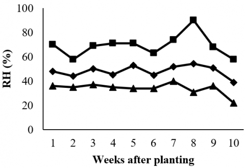 The time of this research was the dry season in May-August 2023. The air temperature in the research area ranged from 25.9-42.5℃ (Figure 1) with relative humidity of 22-90% (Figure 2) and light intensity of 26,300-49,700 lux (Figure 3). Rainfall during the study was low at 0 mm/month.