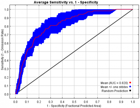 Considering the model’s overall performance indices, the model's performance was adequate to predict the spatial distribution of L. circinnatum. Figure 4 shows that the average AUC of the replicate runs was 0.820, with a 0.046 standard deviation. AUC for training data and test data of replicate runs were 0.899 and 0.819, respectively. According to Vernooij et al. [40], the model's predicted accuracy based on AUC was good (0.7-0.9). In addition, the test data’s omission rate was in line with the expected omission rate, demonstrating the high degree of precision in the generated model. Figure 5 shows the test omission rate and prediction area as a function of the cumulative threshold.