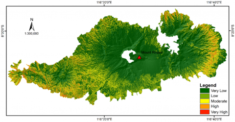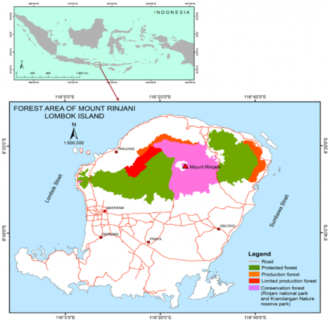 This study was carried out in the forest area of Mount Rinjani, Lombok Island, West Nusa Tenggara Province, Indonesia. It comprises over 117,891 hectares (ha) and lies geographically between 8°14′1″S-8°32′1″S and 116°2′1″E-116°40′2″E (Figure 1). The elevation from the lowest area in the North to the peak of Mount Rinjani ranges from 8 to 3,726 meters Above Sea Level (m a.s.l.). Based on forest functionality, the study area consists of a production forest, a protected forest, a limited production forest, Krandangan Nature Reserve Park, and Mount Rinjani National Park. Generally, the forest area has a moderate climate based on the Schmidt-Fergusson classification [31]. These areas receive rainfall ranging from 500-2,300 mm of rainfall annually. The spatial distribution of rainfall in the study area varies due to elevation differences. The minimum and maximum mean annual temperatures are 23℃ and 27℃, respectively.