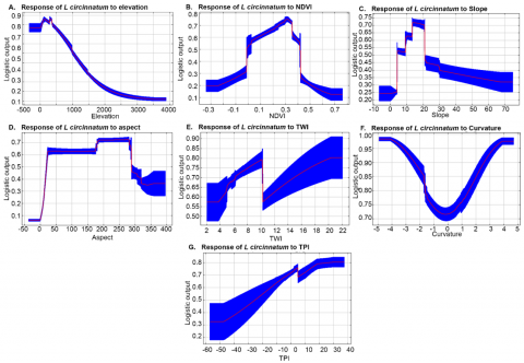 According to the Jackknife plot of AUC (Figure 6(c)), the variables that had high prediction ability were elevation, NDVI, slope, and aspect. It implies that the information contained in these variables is absent from the other variables. Nevertheless, the other variables do not seem to have substantial details related to the spatial distribution of L. circinnatum. Therefore, neglecting curvature, TPI, and TWI did not decrease the model accuracy significantly in terms of training gain, test gain, or AUC.