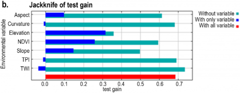 The variable importance was also assessed using the Jackknife test, and Figures 6(a) and 6(b) show the model’s Jackknife output for both training and test gain. The Jackknife test indicated the same pattern between the two gains. Both plots, training and test gain, exhibited that elevation, NDVI, slope, and aspect had higher gain than other variables in isolation. When these variables were used independently, they revealed more insightful data. In addition, these variables were also the variables that decreased the gain the most when they were excluded. Therefore, these variables seem to contain most of the data that is absent from the remaining variables.