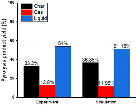 The predictive capability of the Aspen Plus simulation model was assessed by comparing its simulated product yields with empirical data from Miandad et al. [27], who investigated the catalytic pyrolysis of PS utilising zeolite catalysts at 450℃. As depicted in Figure 3, the model accurately represents the primary trends in product distribution, predicting a liquid yield of 51.16% in contrast to the experimental yield of 54.0%, a gas yield of 11.98% compared to 12.8%, and a char yield of 36.86% as opposed to 33.2%. The average absolute error is calculated at 7.6%, which falls within acceptable tolerances for chemical process simulations.