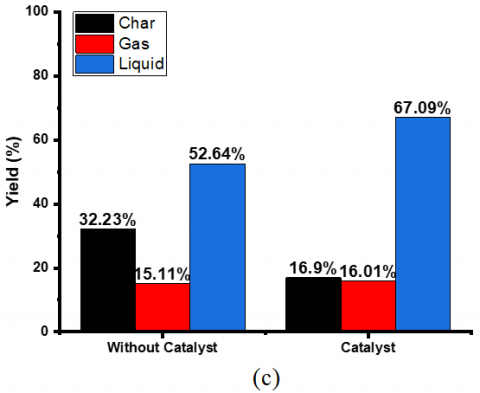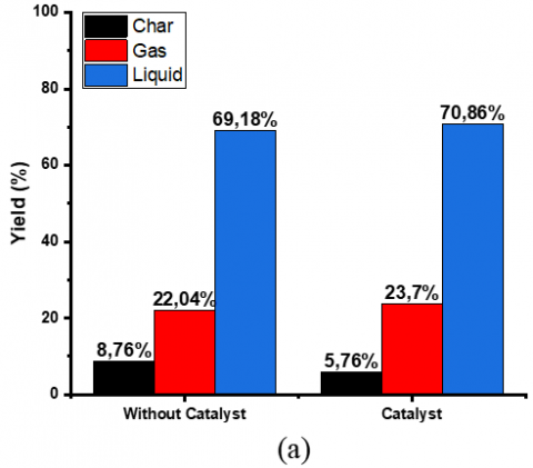 Figure 4. Comparison of the final product of the pyrolysis process without and with catalyst addition for plastic types (a) HDPE, (b) PP, and (c) PS at 800℃