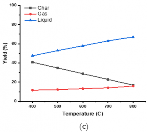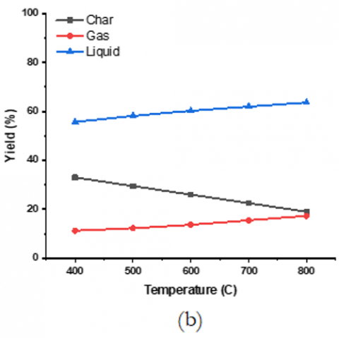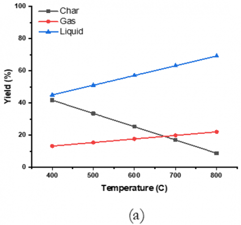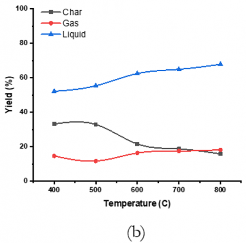 $Yield$ $_{{Gas }}=100 \%-\left(\right.$ $Yield$ $_{{Liquid }}-$ $Yield$ $\left._{ {Char }}\right)$ (6)