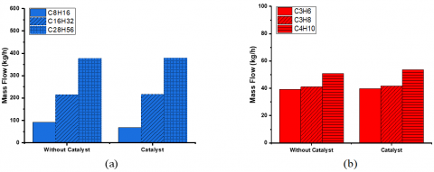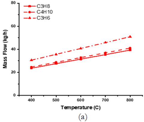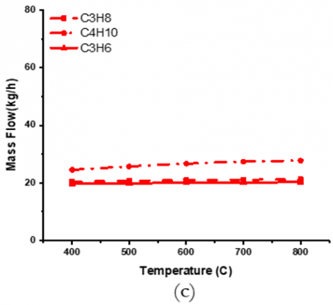 The simulation framework is constructed with specific conditions that accurately replicate realistic industrial pyrolysis parameters. The temperature range is established between 400 and 800℃, facilitating a comprehensive analysis of the effects of temperature on product distribution and conversion efficiency. The process operates at atmospheric pressure (1 atm) to emulate typical pyrolysis conditions. Feed specifications are meticulously defined to ensure consistency for comparative analysis across various simulation scenarios. The plastic feed rate is fixed at 1,000 kg/hr, with a moisture content of 0% on a dry basis, to prevent complications associated with water. The particle size is assumed to be uniformly distributed within the 2-5 mm range, reflecting the characteristics of pre-processed feedstock. In scenarios involving catalytic pyrolysis, the properties of the aluminium oxide (Al₂O₃) catalyst are specified, including a loading of 10 wt% relative to the plastic feed, a surface area of 200 m²/g typical for γ-Al₂O₃, and a particle size range of 0.5-1.0 mm to ensure adequate contact between the catalyst and feedstock.