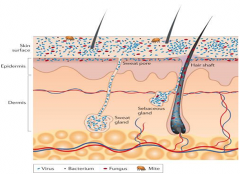 Figure 1. Skin histology schematic in cross-section, viewed with skin appendages and microorganisms
