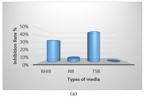 where, ODcontrol = Optical density of the control sample (without extract) was prepared by adding 0.5 ml D.W. and 0.5 ml standardized inoculum of organisms. ODsample = Optical density of the sample containing the extract. was prepared by adding 0.5 ml crude extract to 0.5 ml standardized inoculum of organisms. The blank was prepared by adding 0.5 ml D.W. to 0.5 ml TSB.