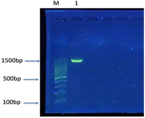 The products of PCR were examined using agarose gel electrophoresis. A prepared 1% agarose gel was made by melting 0.5 g of agarose in 50 ml of 1x TBE (Tris-Borate-EDTA) buffer. Before adding ethidium bromide, the agarose was allowed to cool to a temperature of 50-60℃ to reach a concentration of 0.5 μg/ml. After the gel was poured into a gel tray and a comb, the gel was left to solidify at room temperature.