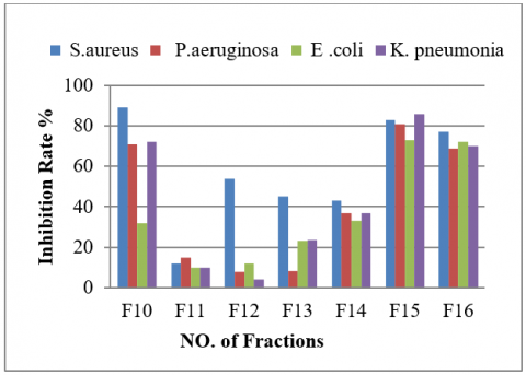 Cultivation of the isolate under optimized conditions promoted the production of bioactive metabolites, as reported in earlier studies [18]. Ethyl acetate proved effective in extracting secondary metabolites, particularly phenolic acids and flavonoids, which are known for their antimicrobial activities [19]. Partial purification using silica gel column chromatography allowed the separation of these compounds, and fractions 10–16 exhibited strong antibacterial activity, with the highest effects recorded in tubes 13–16. The variation in antibacterial activity among the fractions likely reflects differences in compound concentrations and structural characteristics, which influence their ability to interact with bacterial cell walls and intracellular targets [20, 21].