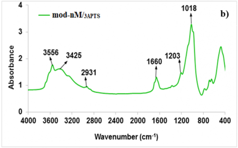 Table 1 compares the elemental composition of nM and mod-nM/3APTS. The increase in oxygen content and the appearance of carbon and nitrogen confirm the successful grafting of 3APTS, while the decrease in magnesium and silicon indicates surface coverage by the silane layer.