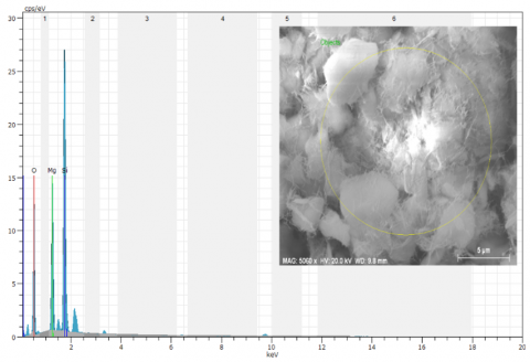 The corresponding EDX spectrum confirms the elemental composition of nM, showing prominent peaks for magnesium (Mg), silicon (Si), and oxygen (O), which are the primary constituents of meerschaum, consistent with its chemical formula (Si₁₂Mg₈O₃₀(OH)₄(OH₂)₄·8H₂O). Minor traces of other elements may also be detected, likely originating from impurities or natural mineral inclusions. The strong presence of Si and Mg peaks validates the silicate framework, while the O peak reflects both structural oxygen and surface hydroxyl groups.